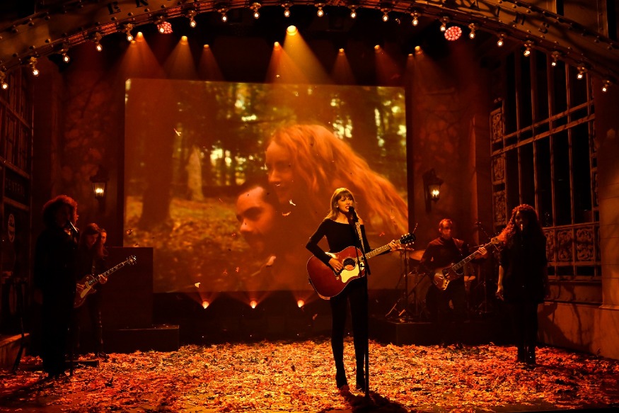 In the first TV presentation of the extended version of "All Too Well", the 31-year-old pop star appeared on stage, covered in leaves, wearing only black and a red lipstick, while playing an acoustic guitar.