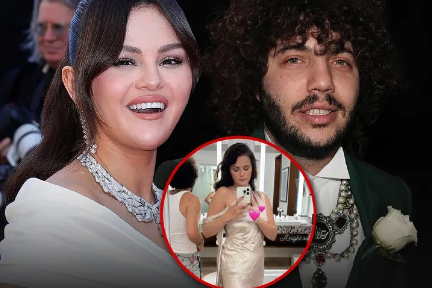 On Thursday, the Only Murders In The Building star shared a mirror selfie showing herself posing in an elegant champagne-coloured dress - with Benny reflected in the mirror behind her.