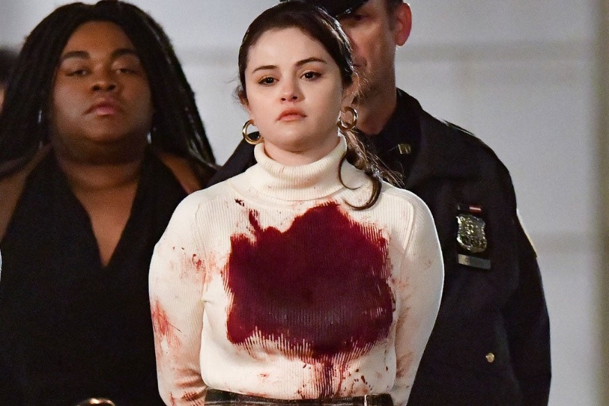 The 27-year-old singer and actress was wearing an ivory-colored sweater covered in fake blood and was escorted out of an apartment building as soon as she was arrested, according to the script of the series.